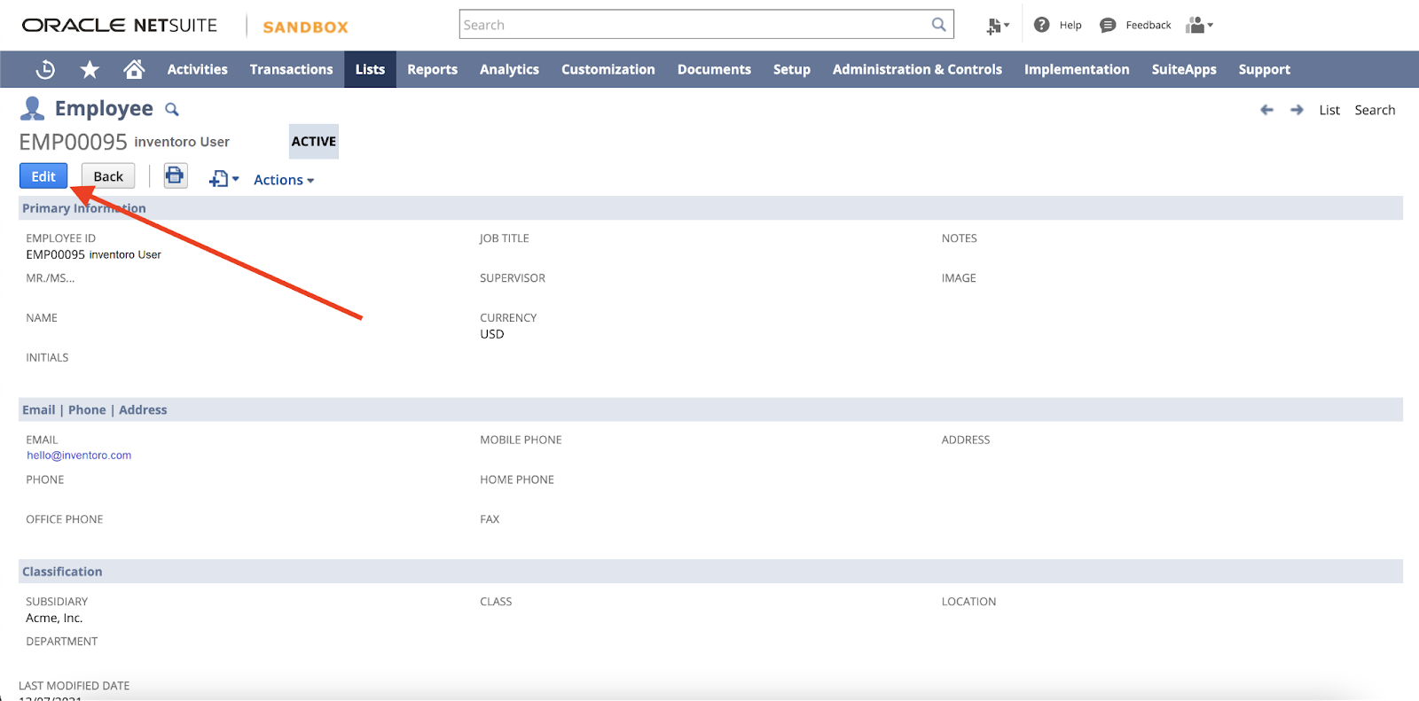 Alternatively, if you already have a User you'd like to use ready, head to Lists > Employees > Employees > Search and open the user.