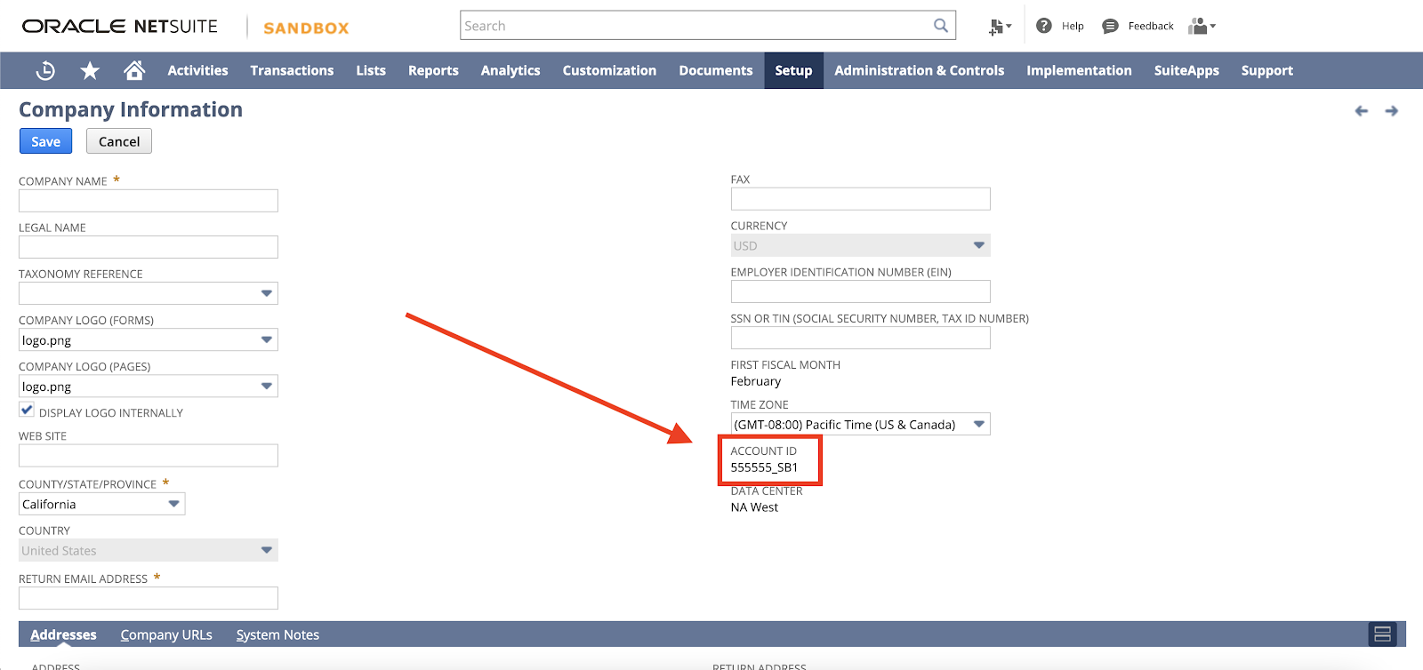On the Company Information page, you will see the ACCOUNT ID label on the right side. Save the number, but leave off the trailing _SB1