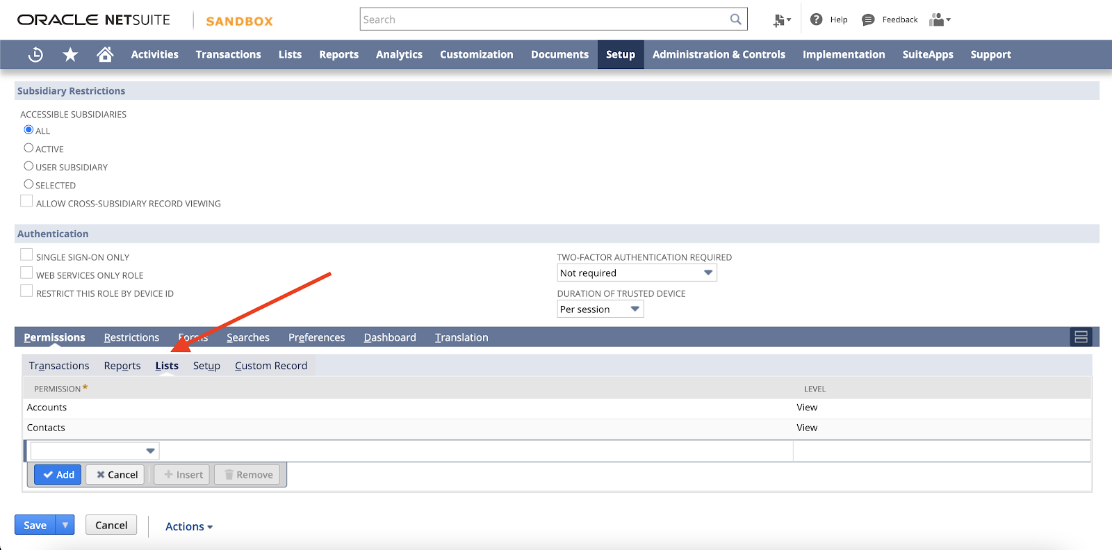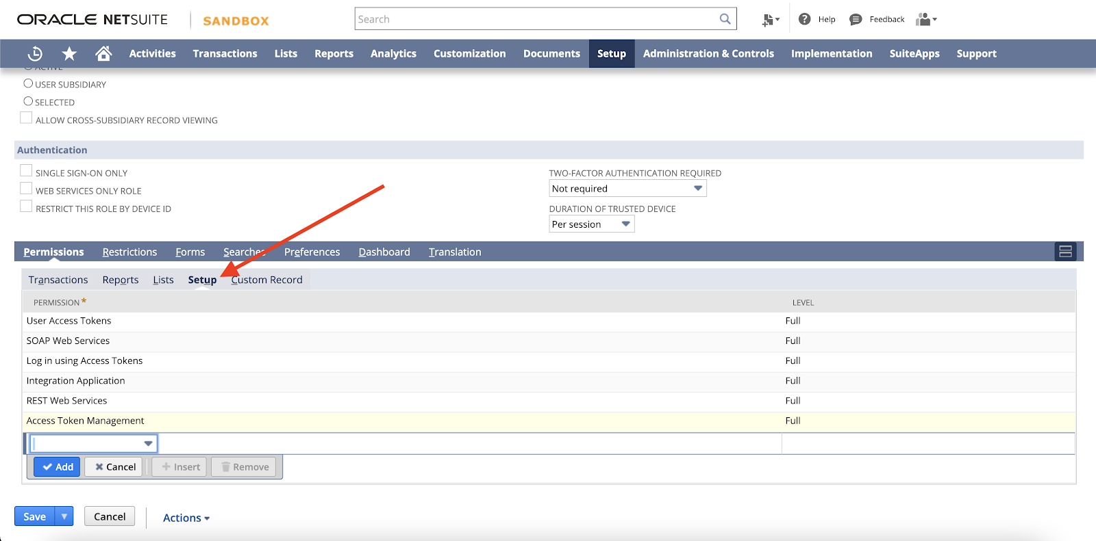 Add the permissions you need to access relevant data in the Transactions, Reports, and Lists sections. See a full list of available objects in the NetSuite docs