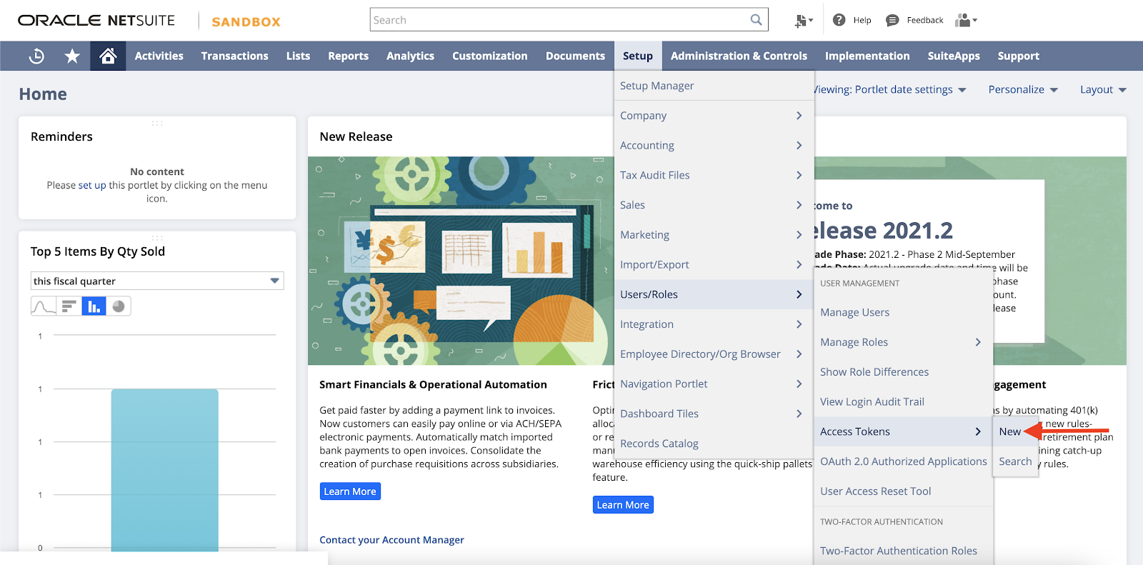 Head to Setup > Users/Roles > Access Tokens > New