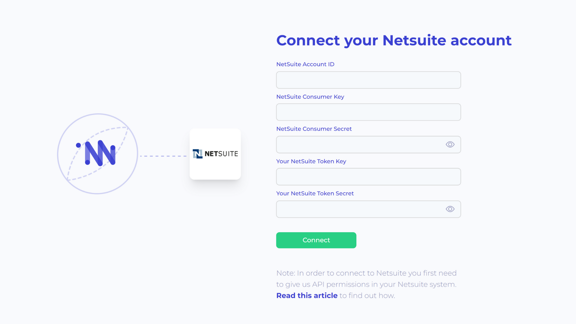 Go back to the ForesightAI app and click Connect at the top right corner of your screen. Choose NetSuite, fill in your NetSuite Account ID, NetSuite Consumer Key, NetSuite Consumer Secret, Your NetSuite Token Key, Your NetSuite Token Secret: