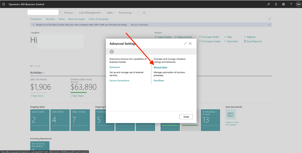 The first thing that you need to do to get your Microsoft Dynamics Business Central credentials is to login to your Microsoft Dynamics Business Central dashboard. If you do not have a Microsoft Dynamics Business Central account, you can create learn how to create one here.