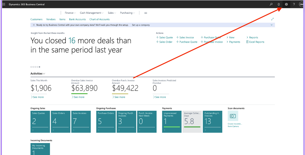 Once in your Microsoft Dynamics Business Central dashboard. The first thing you will need is to grab your Environment ID for Microsoft Dynamics. You can do that by looking the URL of the page and grabbing the highlighted section above. The URL is constructed as businesscentral.dynamics.com/ENVIRONMENT-NAMENext, you should click the Settings icon in the top right hand corner of the page.