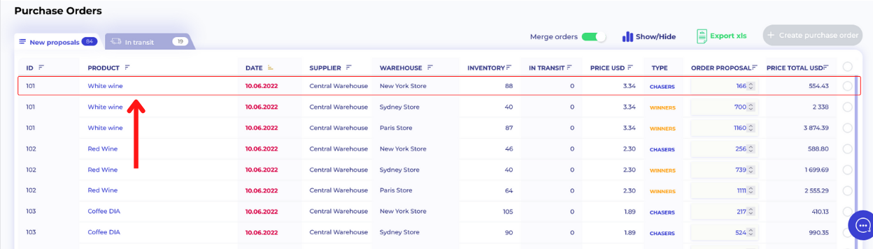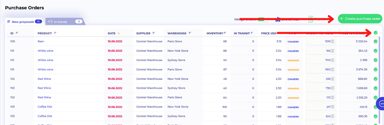 Once you created the purchase order, it will be automatically taken from "New proposals" list and will be marked as "In transit".