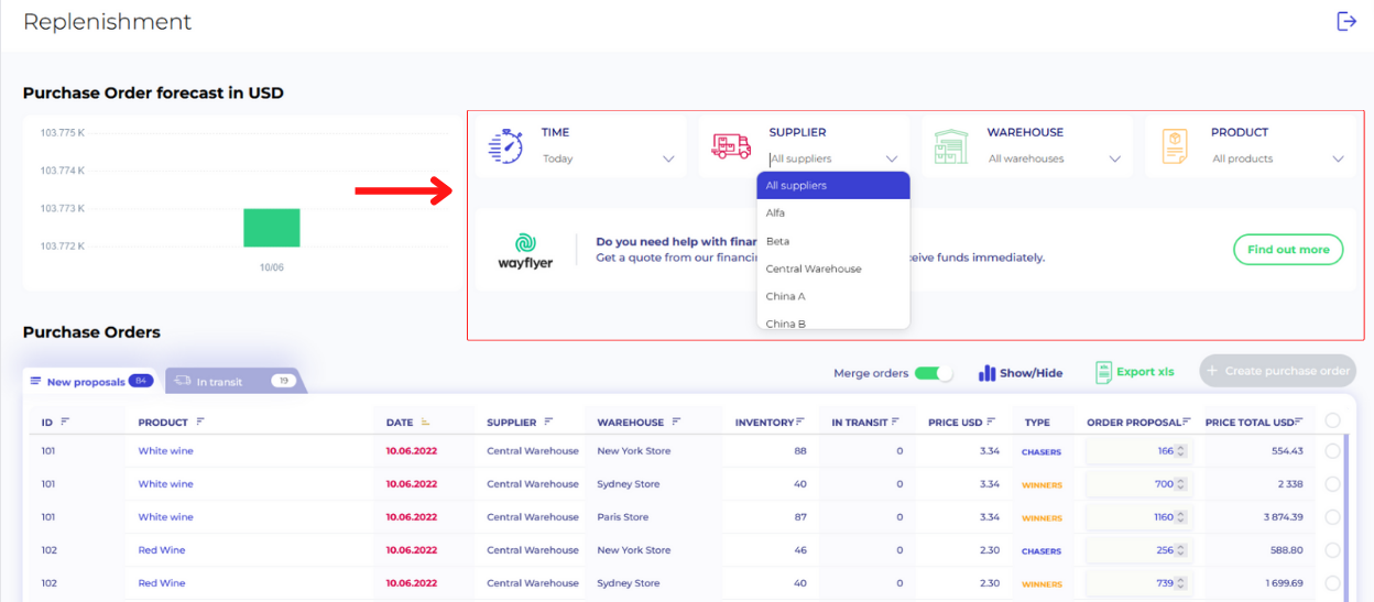 The same rule applies to every other filter - you can break down your orders by supplier, warehouse or a product.Click on a checkbox and then click "Create purchase order" button: