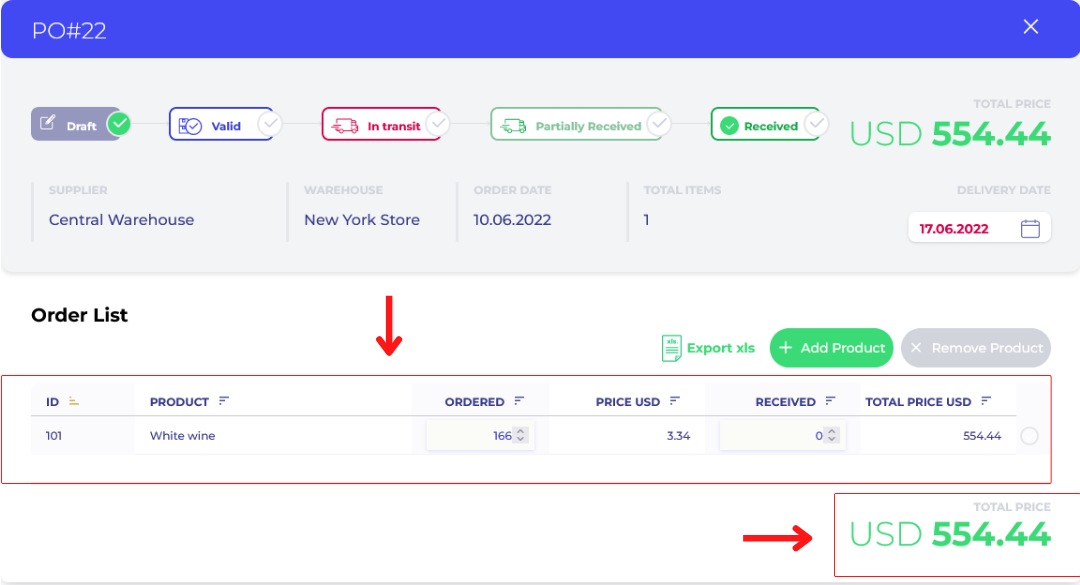 If all is good, click "Valid" and then click "Export xls" and purchase order is ready to send to your supplier.