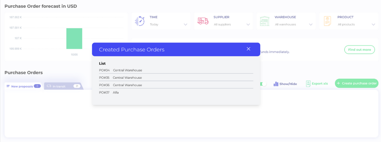 Note: If you want to create purchase orders for all products for today - check the box next to "Price Total USD" column and click "Create purchase order" - ForesightAI will create all purchase orders for today automatically.