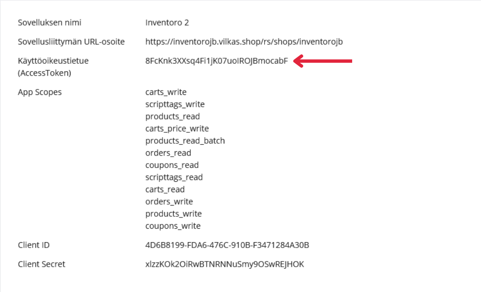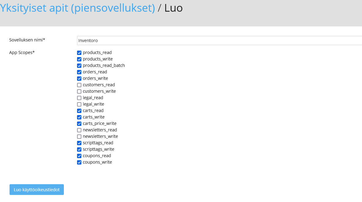 Name your new API connection, tick required check boxes (as on a screenshot) and click Luo käyttöoikeustiedot