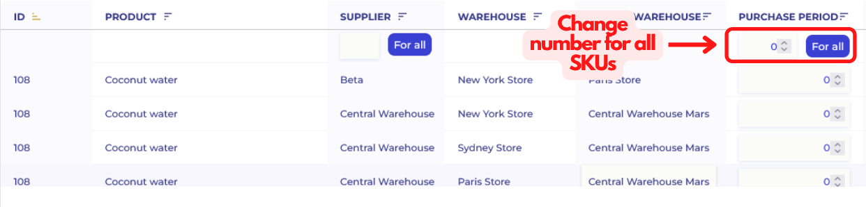 If you need to set a purchase order period for all SKUs change the number above individual SKU rows and then click Confirm.