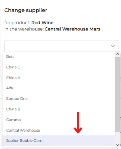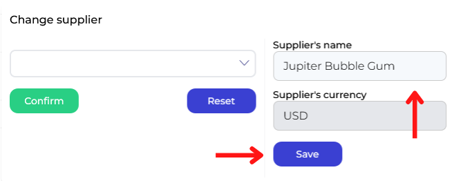 Choose a new supplier from a drop-down menu and then click ConfirmIf you need to create a new supplier click on Create supplier -> Input Supplier's name and click Save. Then you will find a new supplier among existing ones in the drop-down menu.