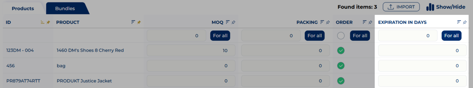Add the Expiration in days for each SKU. You may need to add this field to the table by selecting Show/Hide.
